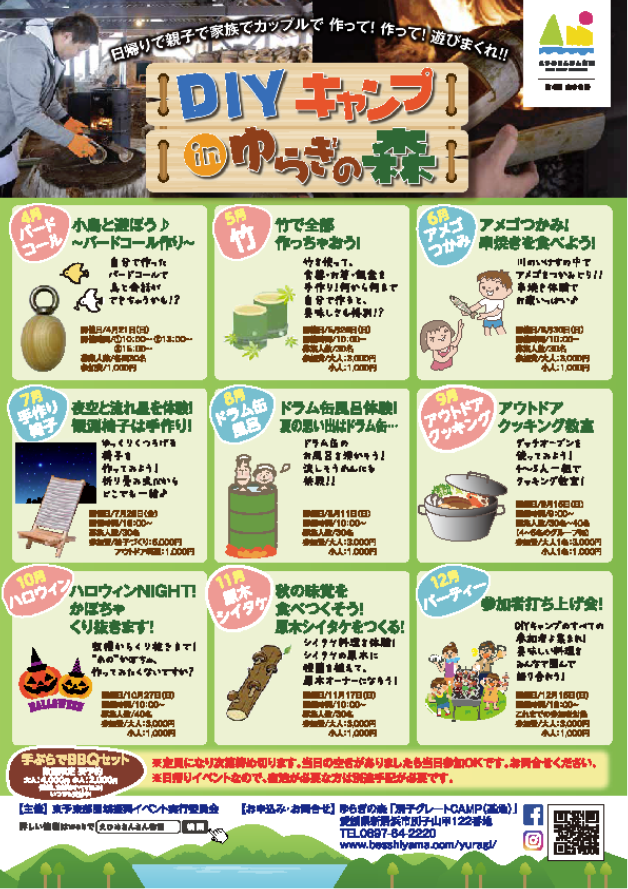 新居浜市のアウトドアフィールド「ゆらぎの森」で開催されるイベント「DIYキャンプ」では、ゆらぎの森スタッフ、DIYものづくり名人、地元の方々といった山のプロの手助けのもと、DIYで様々なものを作ることができます!!