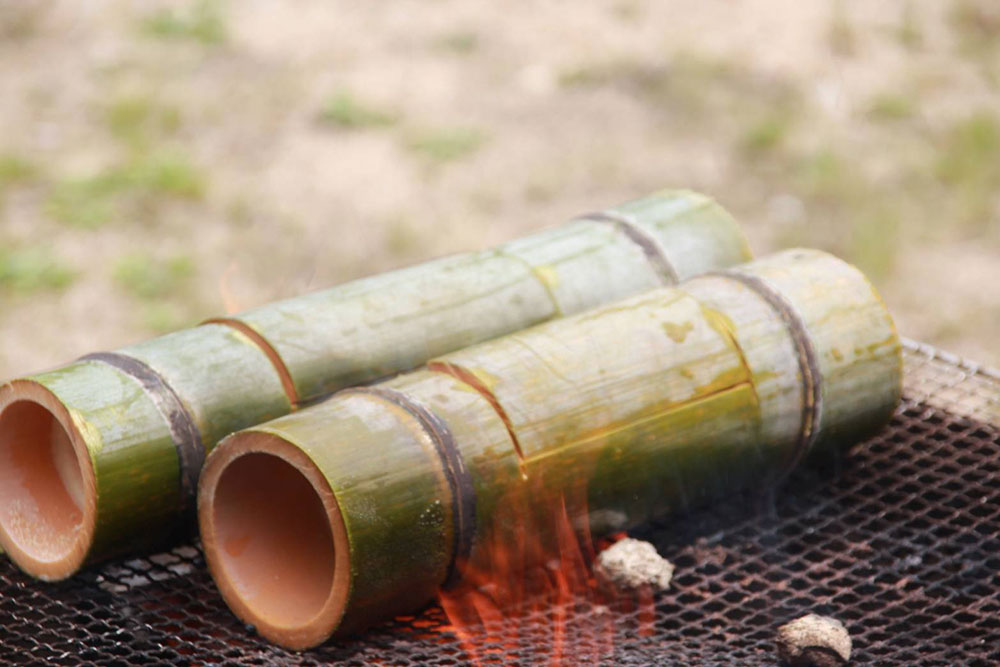 竹を切って器を作り、食材を詰め込んで蒸し焼きにしたり、