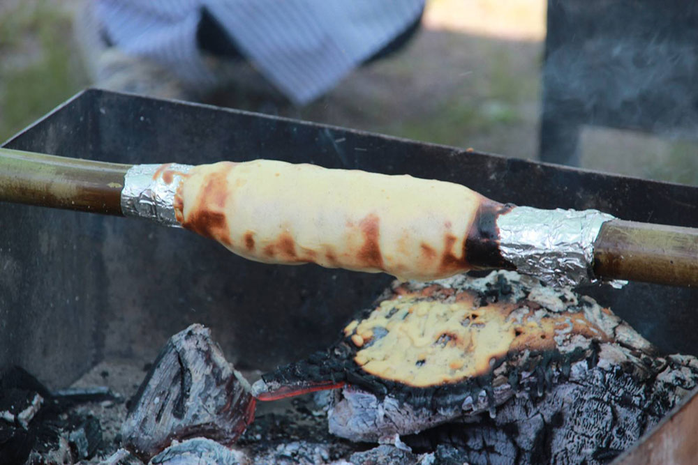 竹に生地を巻き付けて、バウムクーヘンを作ったり。