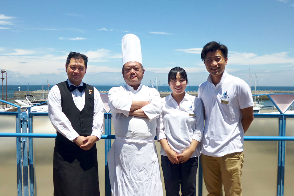 ▲(写真左から)ブラン・ブルーのソムリエ永易貴志さん、シェフ織田尚樹さん、新居浜マリーナサービス株式会社のスタッフ大元さん、スタッフ安富さん