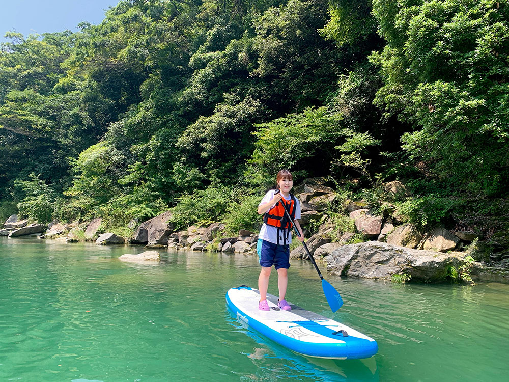 私はのんびり漕いだり、SUPの上で寝転んだりしてゆったり過ごしました。体験時間中に、特にやることは決まってはいないので、自分に合った楽しみ方ができます。例えば、漕ぐ技術を磨いたり、飛び込みなどの川遊びをしたり、水中の小さい虫や魚を見たりなど、楽しみ方は本当に自由です。(上田さんのカヤックとつないで、引っ張ってもらうのもすごく気持ちよかったです)