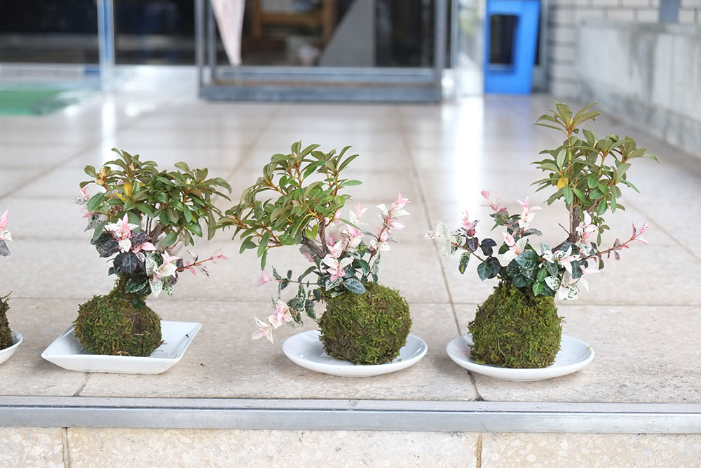 「苔玉づくり体験」では、盆栽に欠かせない苔を使い、球状の土台に苔を植え付け、それを盆栽の鉢に見立て木や花も植えます。手入れの簡単な苔で土を覆うことで水やりなどがしやすくなり、持ち帰った後も自分で苔玉を育て続けることができます。