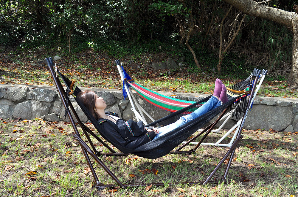 ハンモックといえば、木と木の間に布を吊るして、その布に寝てゆらゆらするというイメージがありますよね。でもハンモックってそれだけではなくて、地面に接地する自立タイプもあったんです!