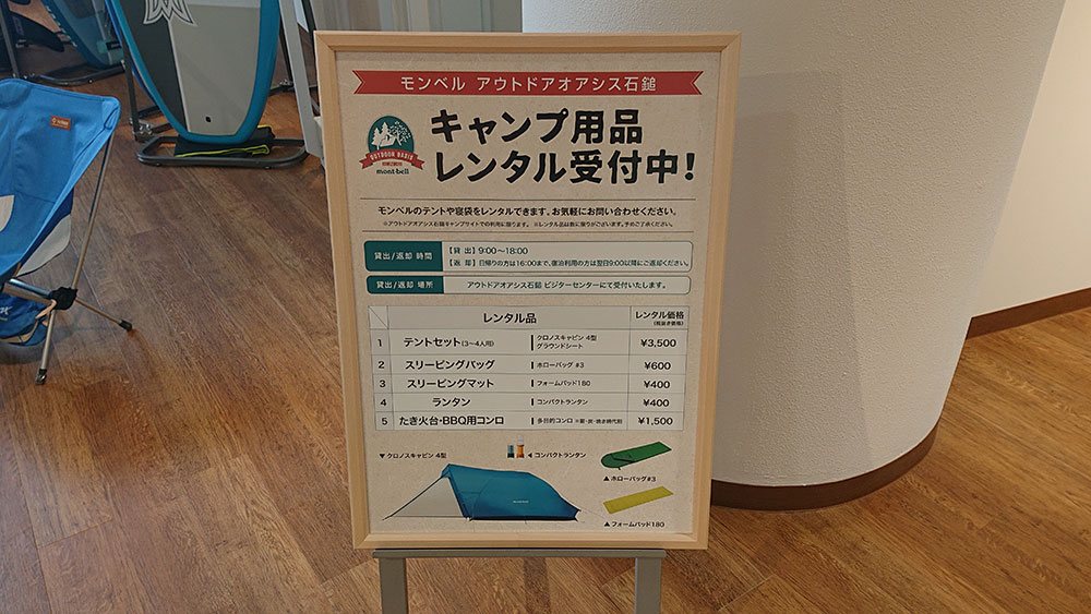 キャンプ場で利用できるレンタル用品も、もちろんモンベル製品です。