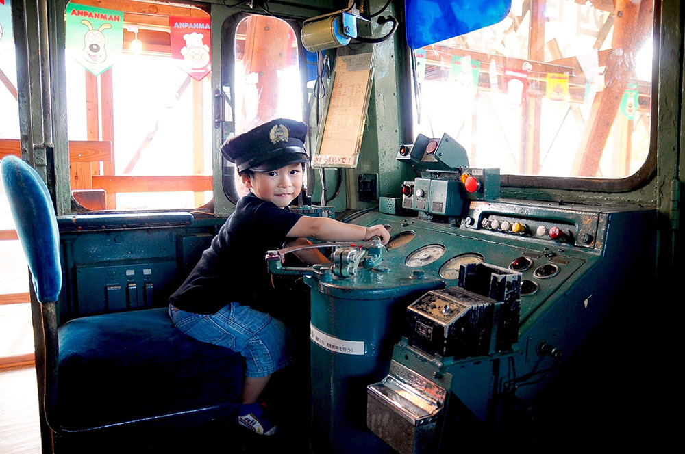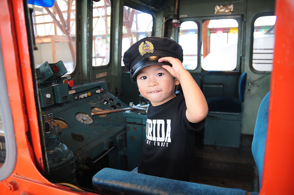 こちらは、DF50形ディーゼル機関車の運転席。運転手気分を盛り上げる帽子は、受付横で自由に借りられます。このDF50形ディーゼル機関車は、日本でただ1台、走行可能な状態で保存されていたもので、「準鉄道記念物」にも指定されている貴重なものなんですよ。