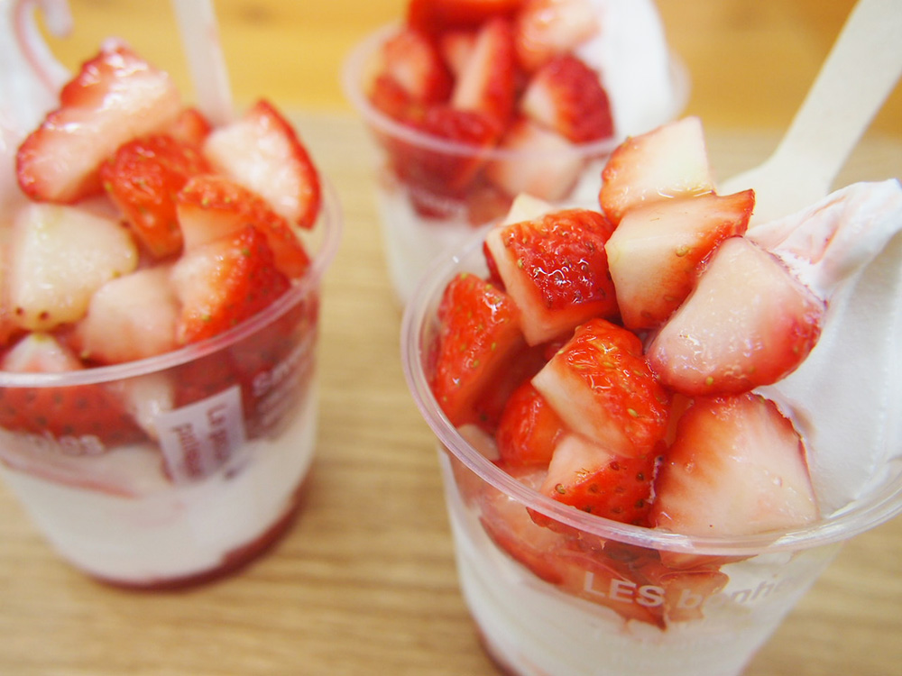 今の時期は旬のいちごを使った生いちごソフトが大人気。