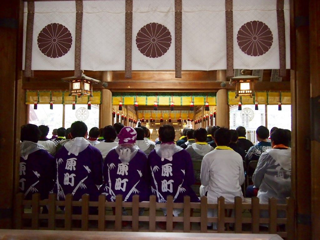 さっきまで御神門前はだんじりや見物客でにぎわっていましたが、その後拝殿では各だんじりの代表が集まり、静まり返った中で厳かに神事が執り行われました。