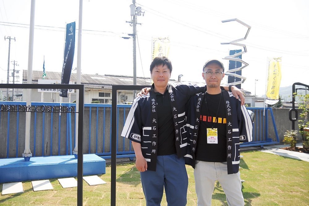 ▲大石工作所の大石憲一社長(写真左)と彫刻家の柳原絵夢さん(写真右)。スッと肩を組む仲良しぶり。