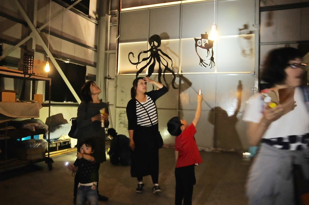 子どもたちが楽しそうに懐中電灯で照らしながら、ステンレスのオブジェを探し、影絵を見て大興奮。