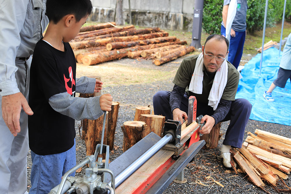 子どもたちが興味津々だった、丸太切り・薪割り体験。