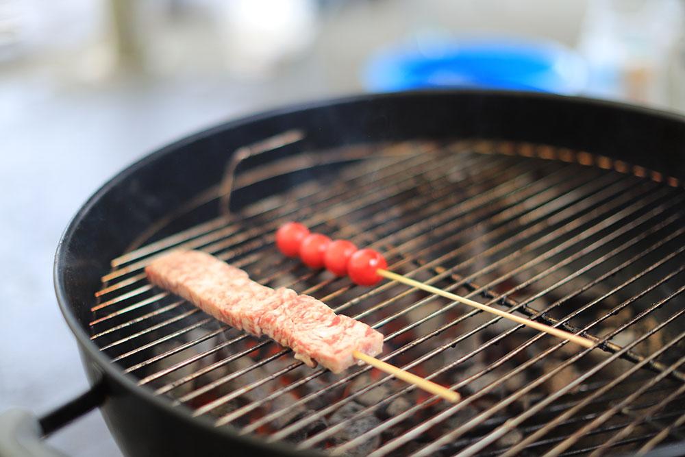 お肉とミニトマトの串を1本ずつもらい、グリルで焼いていきます。