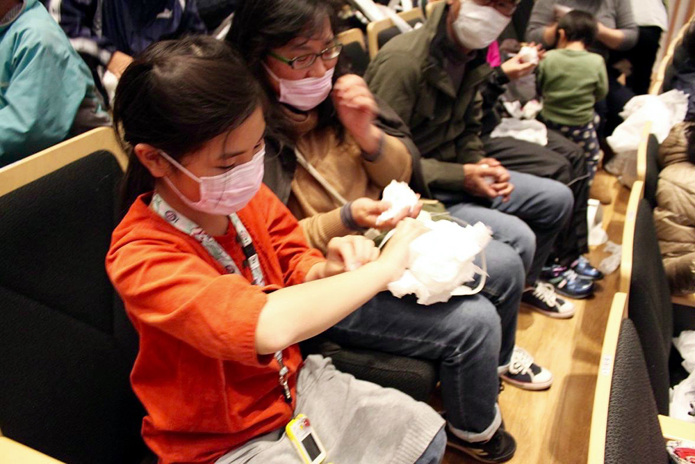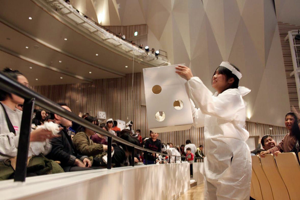 司令塔からの「やぶって丸めてー!」のかけ声が飛ぶと、一斉に破かれ、小さなティッシュボールが山のように。そして、通路に待機するエリートサーカス団員(地元の高校生たちが大活躍!)が持つ箱めがけての玉入れがスタートしたのでした。