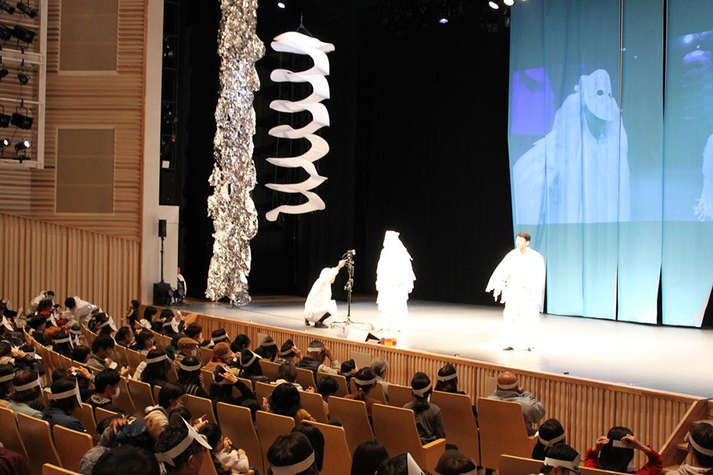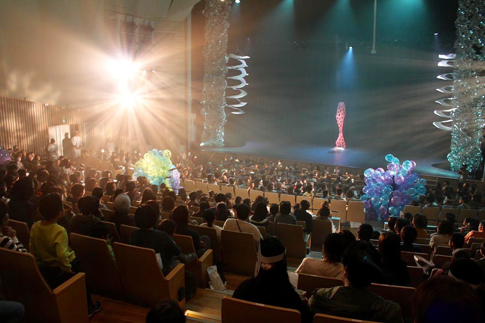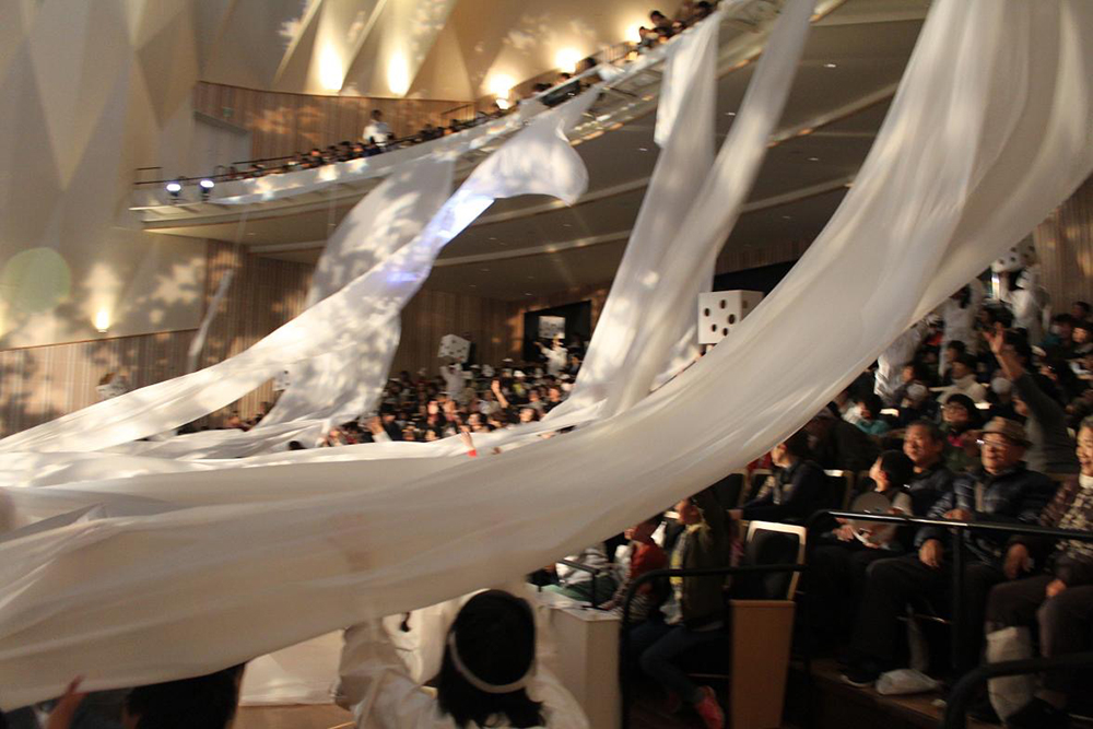 パフォーマンスの随所で、地元の子どもたちが大事な役どころを担い、なにもかもが完璧に調和していく……。いつのまにか、あれだけ騒がしかった会場がしずまり返り、子どもたちも一緒に海のものがたりに飲み込まれていったのでした。