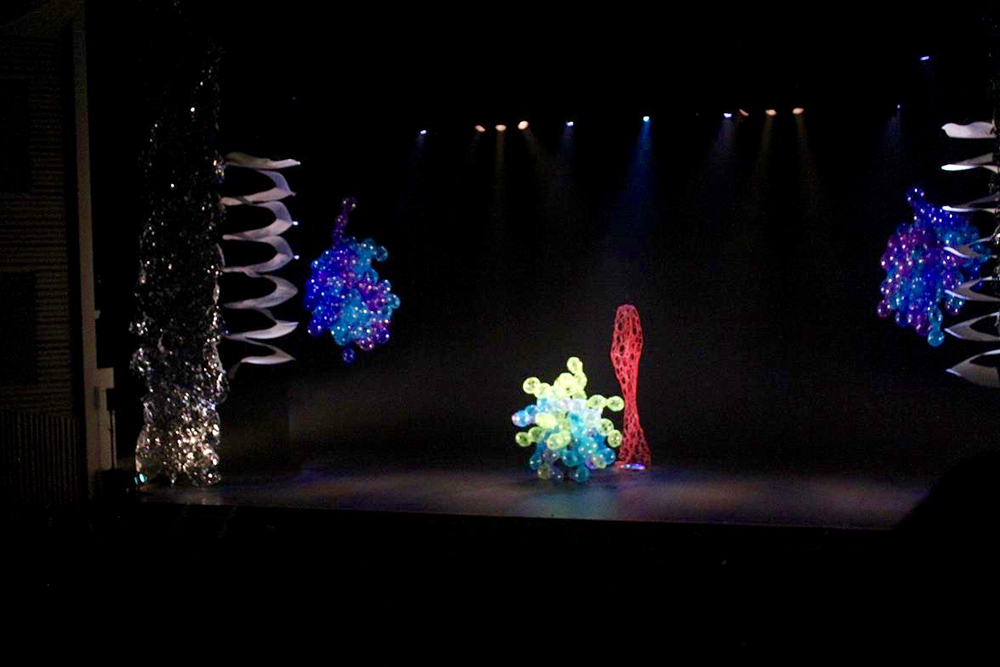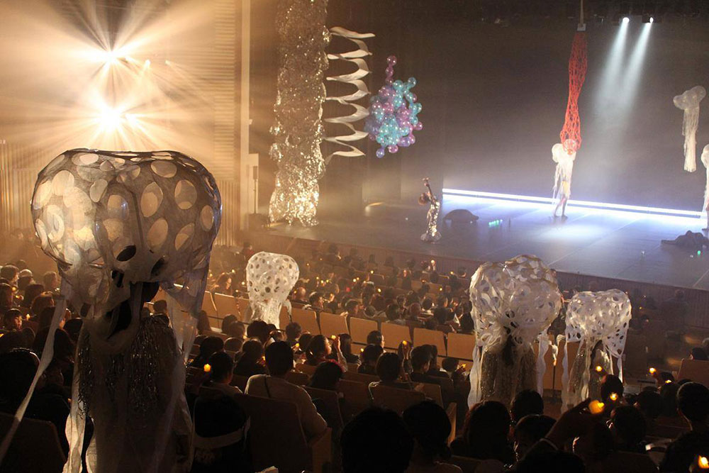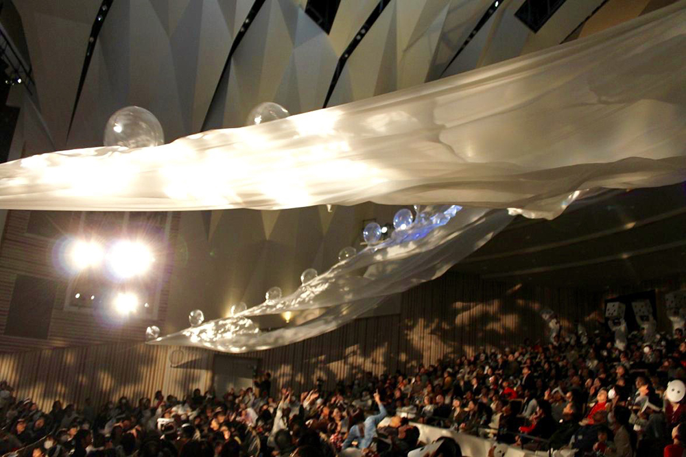 風船と紙につつまれたクラゲは、ライトに照らされ、ほのかに浮かび上がります。なんだか本当に生きているみたい……。観客が持つ小さな灯りとともに、舞台全体が生命力をみなぎらせていきます。