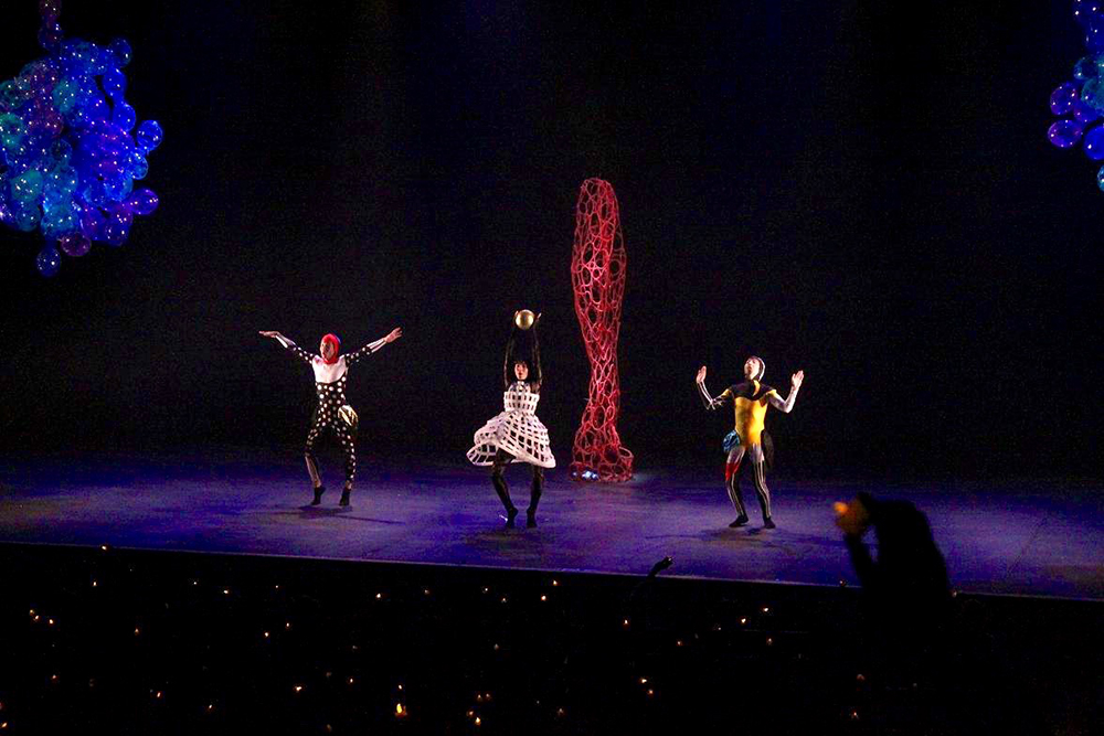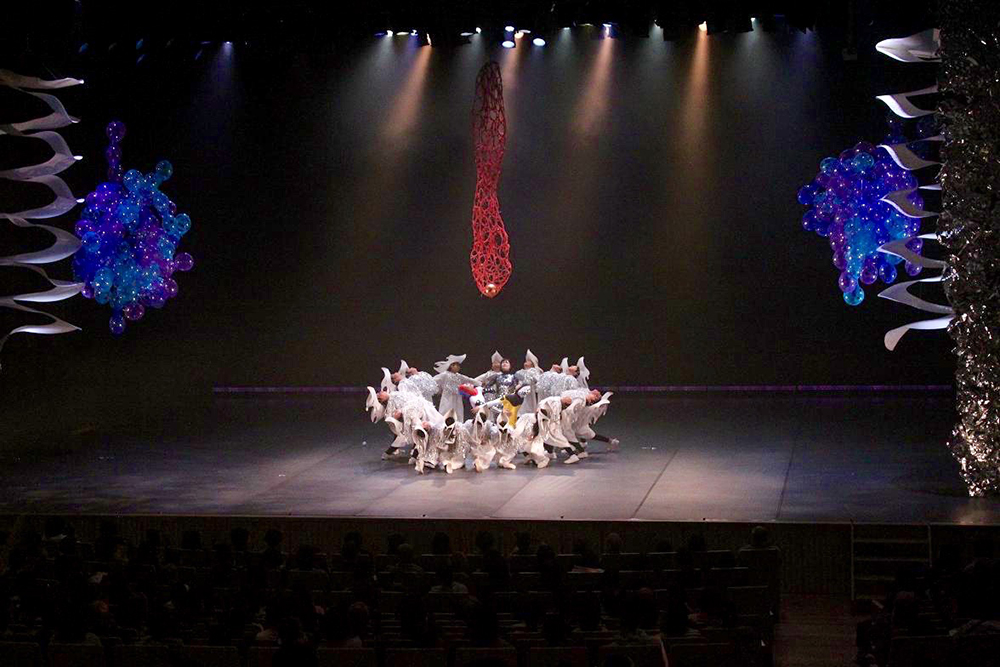 ダンサー引間文佳さんによるしなやかな体の動き。ジャグリングやダンスで本領発揮のホワイトアスパラガスのお二人。作曲家川瀬浩介さんの心地よい音楽に乗せて、ひびのさんのコスチュームがまるで生きているみたいに揺れています。