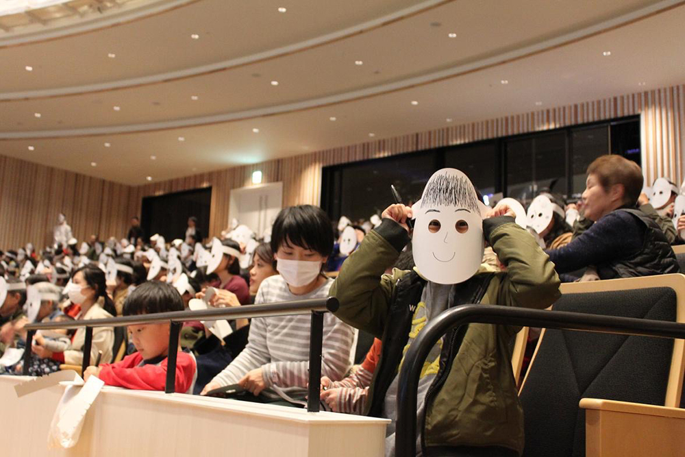 受付時に手渡されていた紙袋を開けると、中には紙のお面が。「お面をデザインせよ!」との指令で、ペンで好きなようにカスタマイズして装着完了!