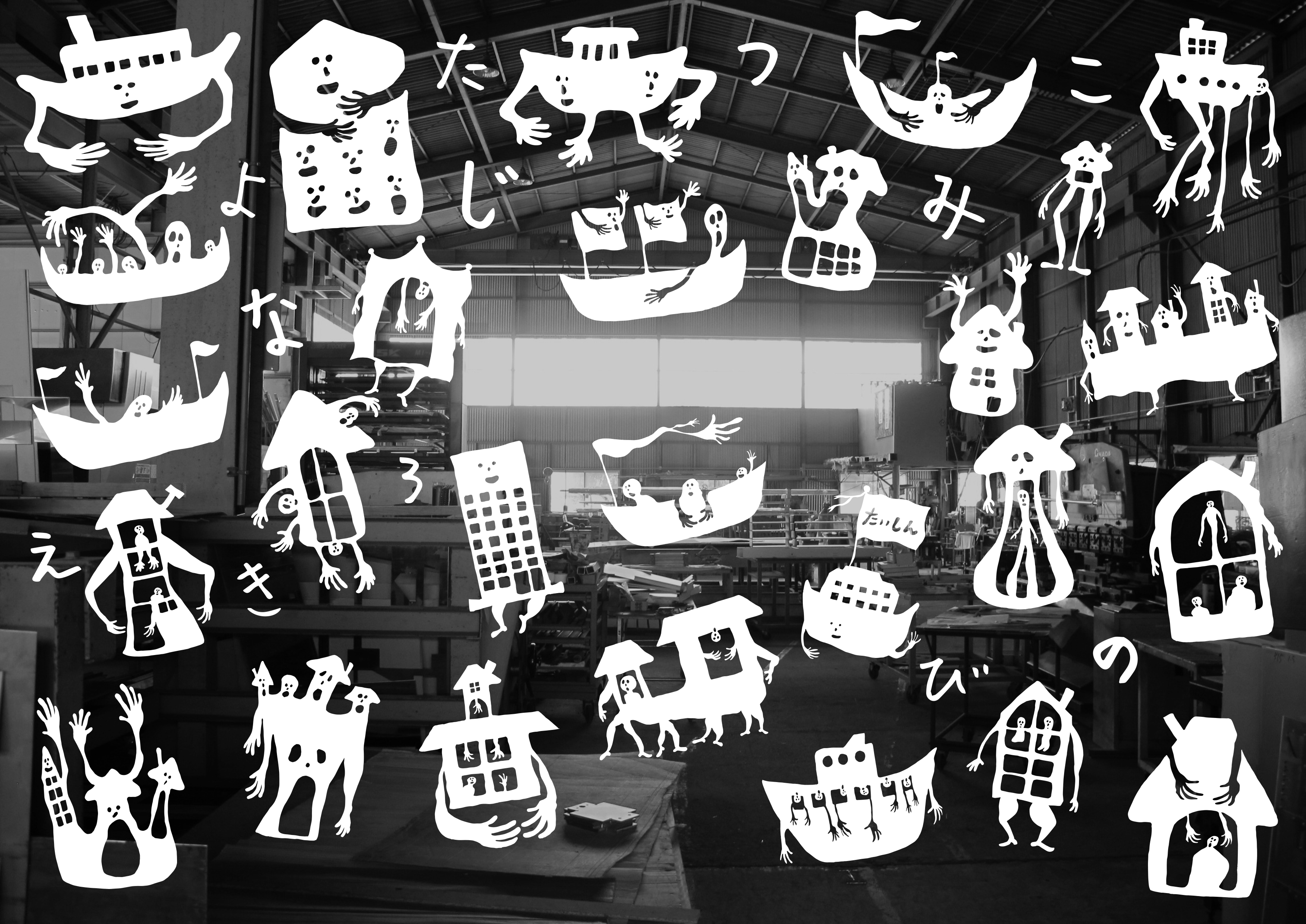 作品制作にあたり、社員の皆さんひとりひとりから、海や船にまつわる思い出をインタビューしました。それをベースに、この場所にふさわしい物語をつくることにしました。工場内を、夜の海や街に見立てて、大伸ステンレスの技術を駆使した大小様々なステンレスのオブジェを展示。中でも限られた制作時間の中で、社員の皆さんが制作する巨大な作品は、ステンレスならではの魅力があり、造形素材としての可能性を強く感じるものになっています。