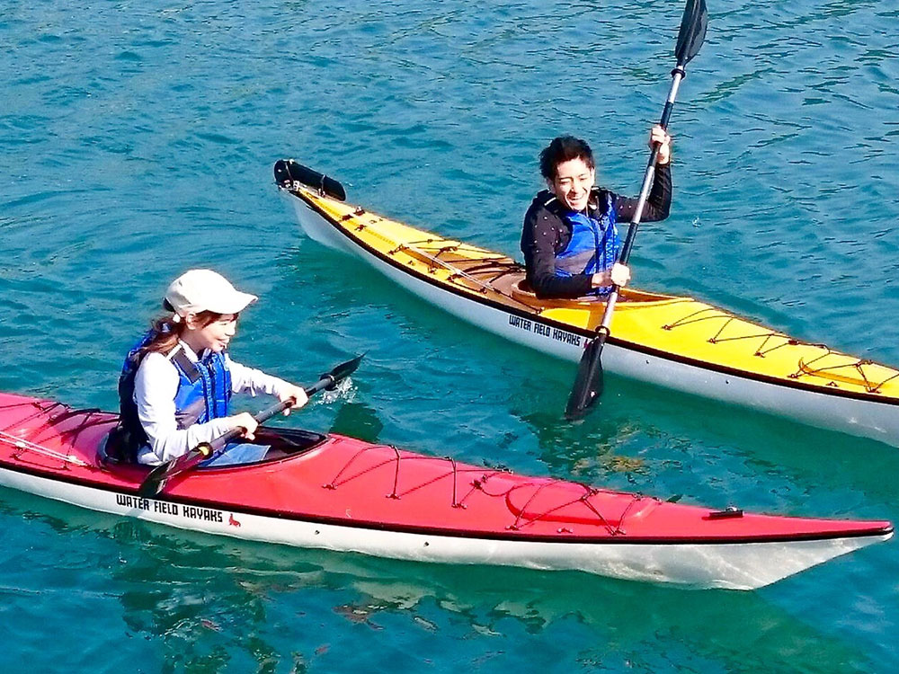 A)カヤック体験が初めての方は、ほとんど楽しかったねとおっしゃってくれます。誰もがプカプカと浮きますし、知り合い同士で参加されると、誰が早く漕げるようになったかとか、そうやって楽しく体験していただいています。