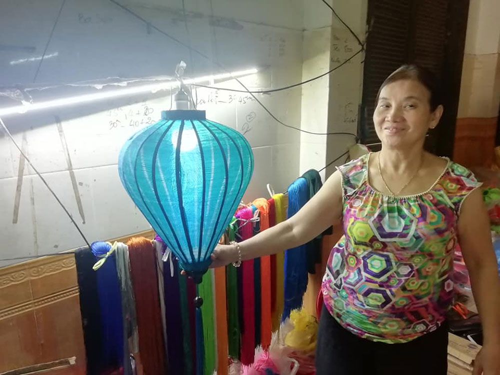 ベトナムランタンは、日本でいうところのちょうちん。しかし、骨組みは横ではなく縦に組まれ、白を貴重とした和紙を使用したちょうちんの多い日本とは対称的に、色とりどりの布を貼り付けて作ることで、多彩な色のランタンになります。