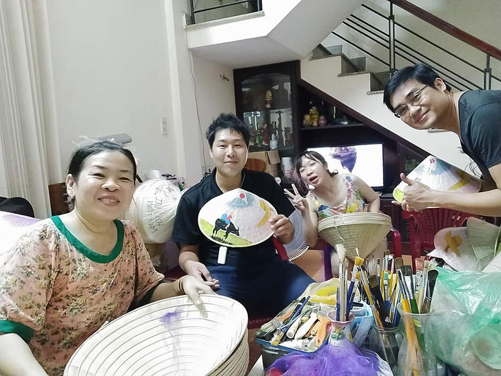 支援センターでは、「ノンラー」と呼ばれるベトナムの麦藁帽子に絵付けをする体験もできます(300円を予定)。日本の、三角形の蓑笠と呼ばれるものに形は似ていますが、素材はムレにくい麦わらが使われています。それもノンラー専用の頑丈で特殊な藁が使われています。