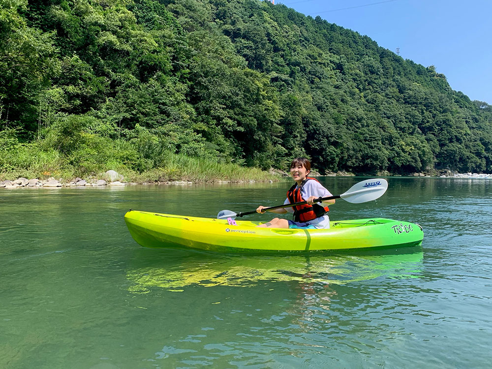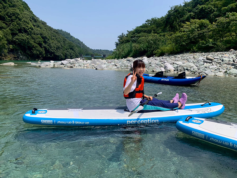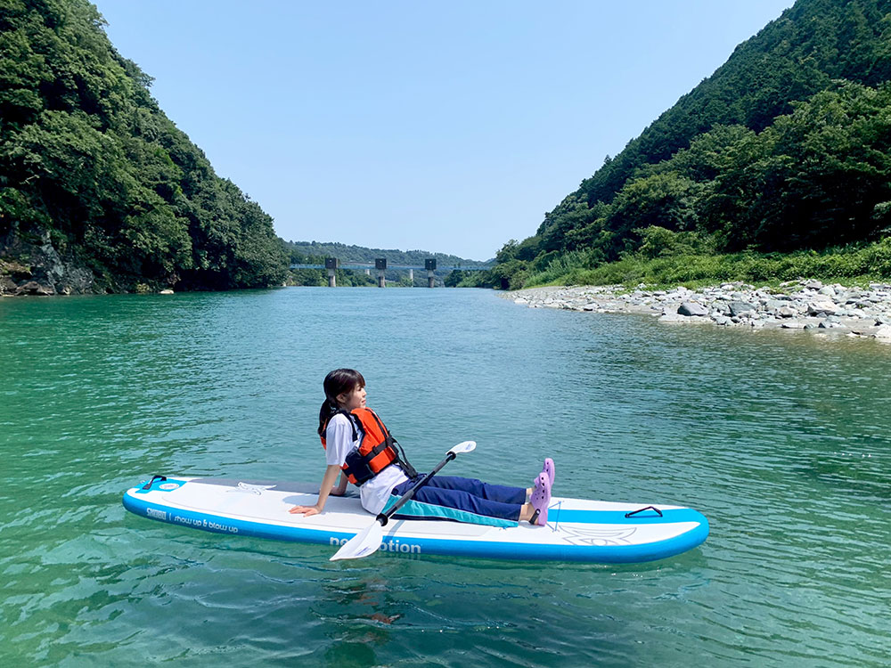 私はのんびり漕いだり、SUPの上で寝転んだりしてゆったり過ごしました。体験時間中に、特にやることは決まってはいないので、自分に合った楽しみ方ができます。例えば、漕ぐ技術を磨いたり、飛び込みなどの川遊びをしたり、水中の小さい虫や魚を見たりなど、楽しみ方は本当に自由です。(上田さんのカヤックとつないで、引っ張ってもらうのもすごく気持ちよかったです)
