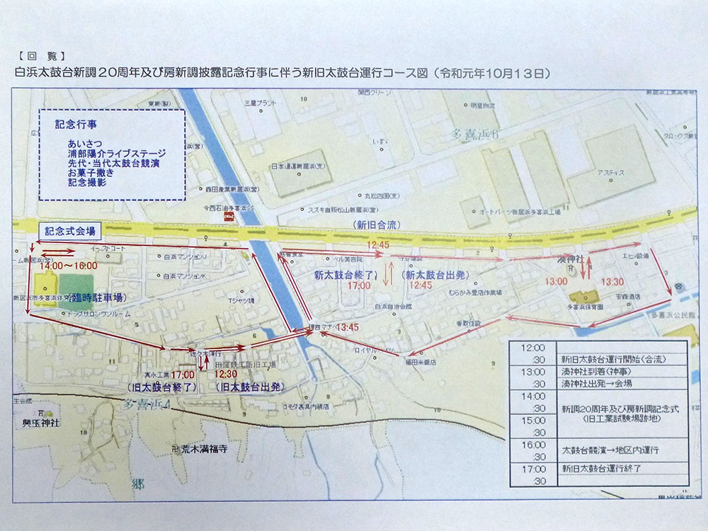 新旧2台の太鼓台がそろう1日限りのイベント(第4話「房の物語」)は、新居浜太鼓祭りの本番を目前に控えた10月13日(日)です。2台の太鼓台が白浜地区を練り歩き、ステージイベントなども行われます。