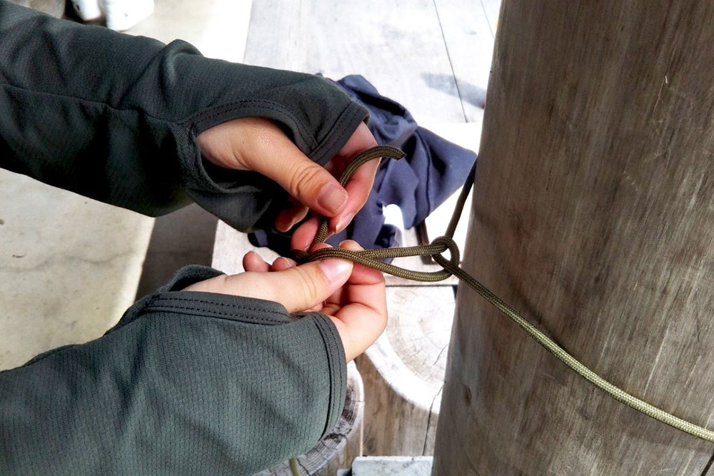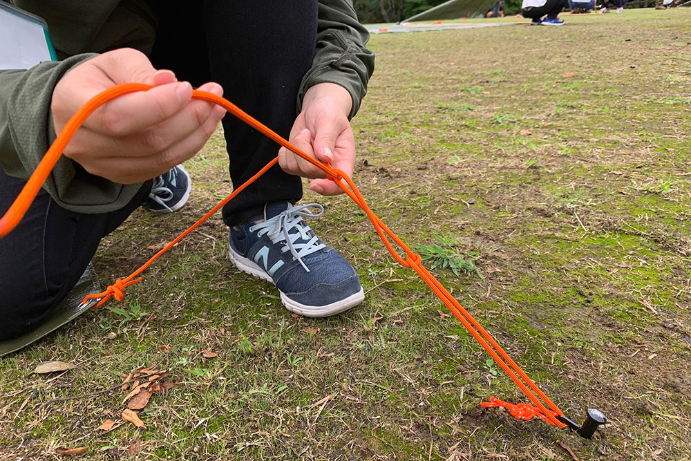 ▲テントのロープを結んでいます。この結び方は「自在結び」。長さの調節が可能な結び方です