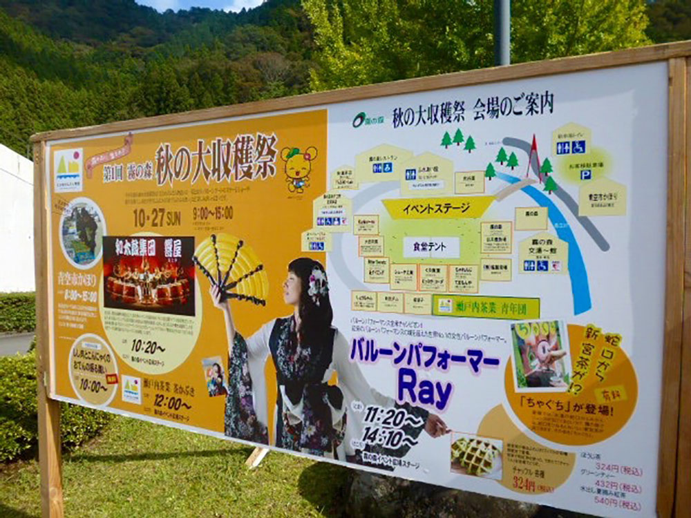 会場の「霧の森イベント広場」では、「第1回霧の森秋の大収穫祭」が開催されていました。ここでは地元新宮の新鮮な野菜や果物、スイーツなどを販売するたくさんのお店が出店。バルーンアートのショーなども行われており、子どもから大人まで楽しめるイベントです(秋の大収穫祭のレポートはこちら)。その一角にブースを構えていたのが「お茶万博」です。
