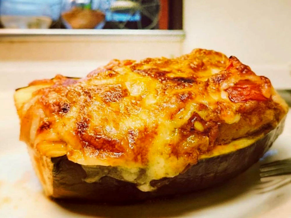絹かわなすをお皿がわりにしてミートソース、チーズを乗せてオーブンで焼くと、ぼてなすボートのできあがり。
