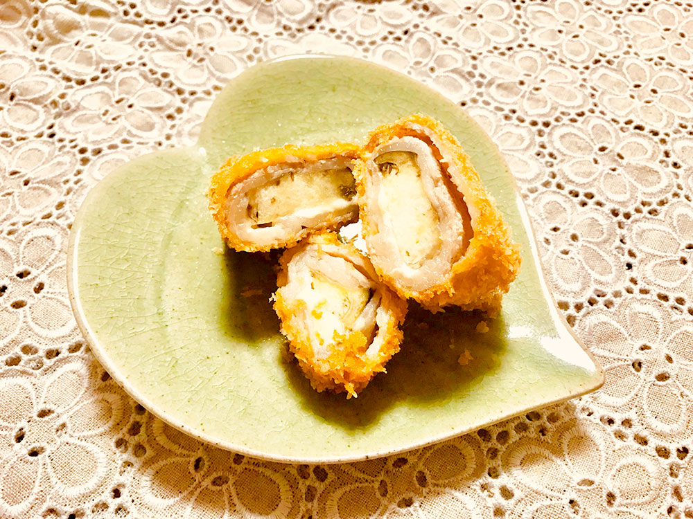 揚げた絹かわなすは柔らかくて、チーズと豚肉にとっても合います。