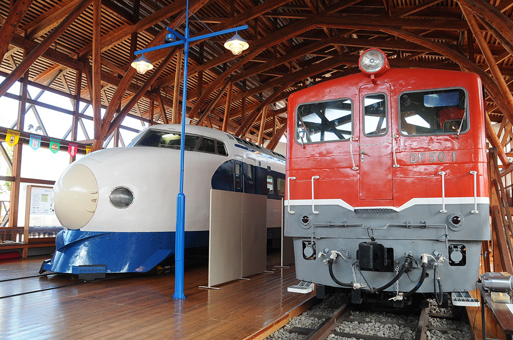 昭和39年の新幹線開業時に登場した初代0系新幹線(写真左)と、国鉄近代化の中核を担ったディーゼル機関車DF50形の1号機(写真右)です。
