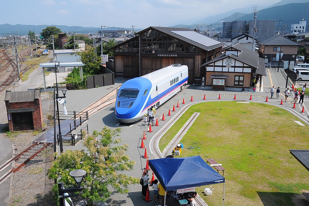 南館から飛び出している青い電車は、新幹線と在来線の両方の線路が走行可能な「フリーゲージトレイン 第2次試験車 GCT01-201」。平成25年に試験走行の役目を終え、今はここで車体を休めています。