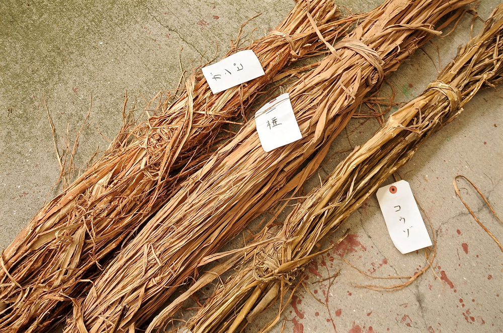 これが和紙の原料です。写真左から、ガンピ、三椏、コウゾ。