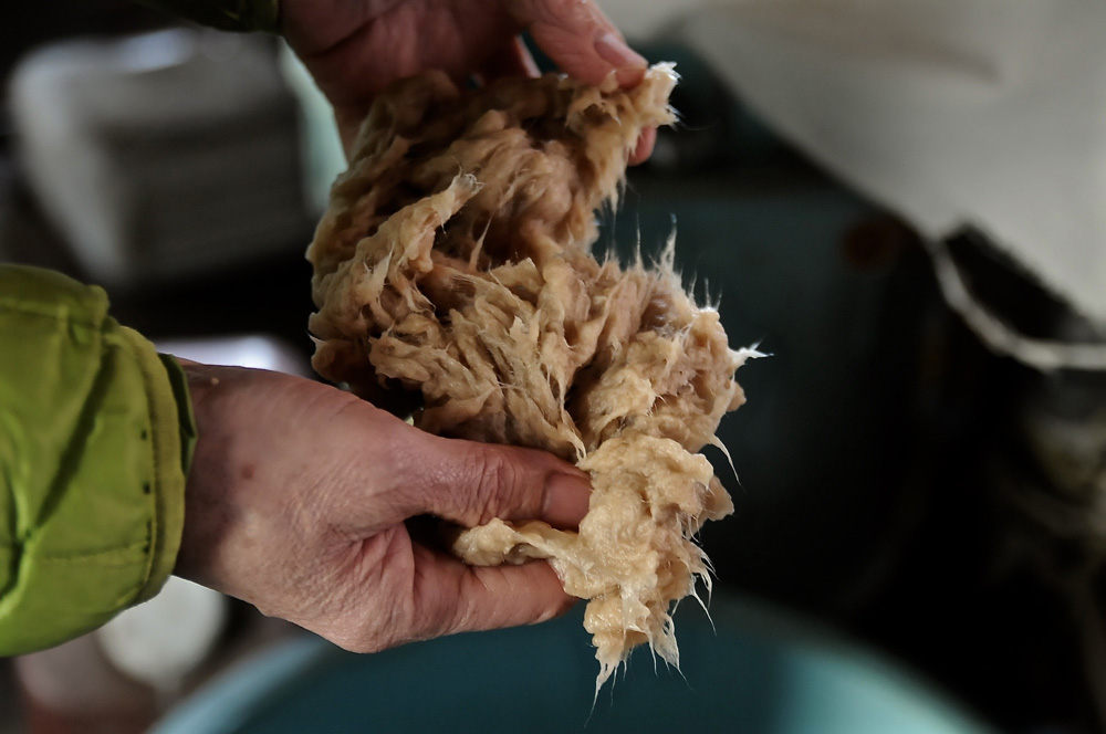 コウゾの場合は、繊維が長くてスクリーンが使えないので、なんと手作業でゴミを取るのだそう。
