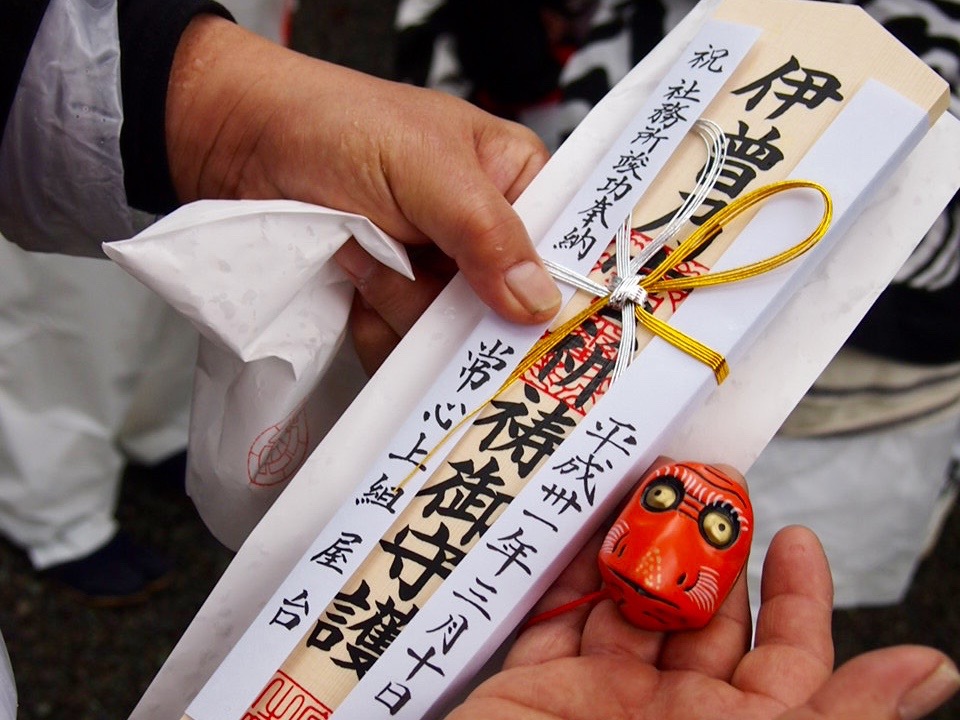神事が終わり、各だんじりには授与品として祈祷札と破魔鬼(はまき)が手渡されました。「破魔鬼」とは魔除け、開運厄除等繁栄をもたらしてくれる福の神のこと。