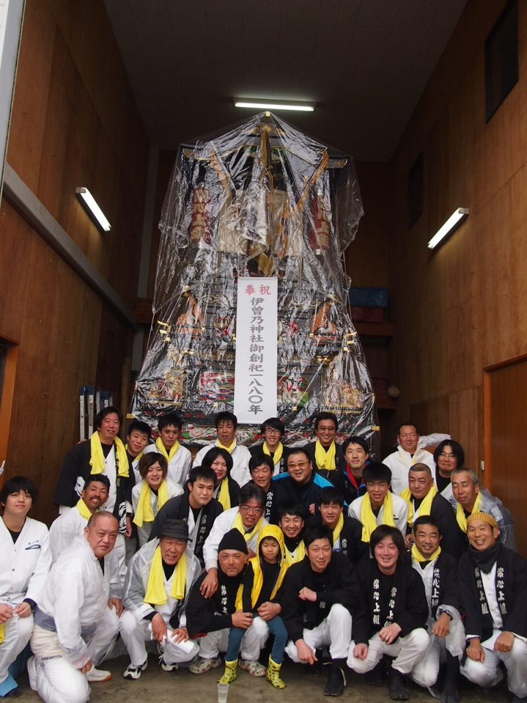 3月10日、この日は伊曾乃神社社務所改築竣工祭の屋台奉納のため、氏子の神戸校区から安知生、大町校区から常心上組・川原町・北之町上組・新玉通・岸陰・清水町の合計7台のだんじりが参加。
