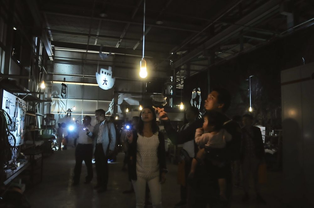 ここでもファクトリーツアーに同行。「海」に見立てた工場内に入る前に、参加者に懐中電灯が配られ、美術家の牛島光太郎さんから作品への思いが伝えられました。