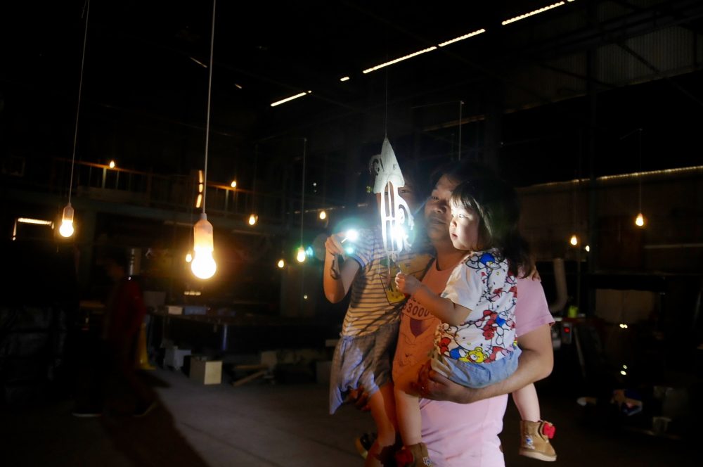子どもたちが楽しそうに懐中電灯で照らしながら、ステンレスのオブジェを探し、影絵を見て大興奮。