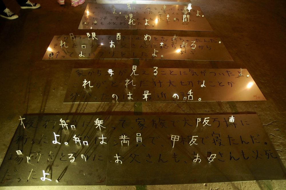 「床や目の高さにも作品があります。社員の皆さんは、工場の(海の)近くに住んでいるとのことだったので、一人一人に海にまつわる話を聞きました。思い出、記憶、経験…海との関係は独特で、楽しい話ばかりではないかもしれないけれど、それが『新居浜らしさ』だと思ったから。懐中電灯で照らして、影絵の美しさを見ながら楽しんでください。日常的にここで営まれている仕事も想像してみてくださいね」