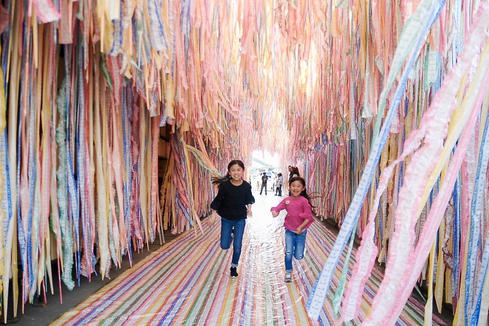 到着してすぐ、店舗横の通路を床から天井まで覆う、カラフルなトンネルが視界に飛び込んできました。