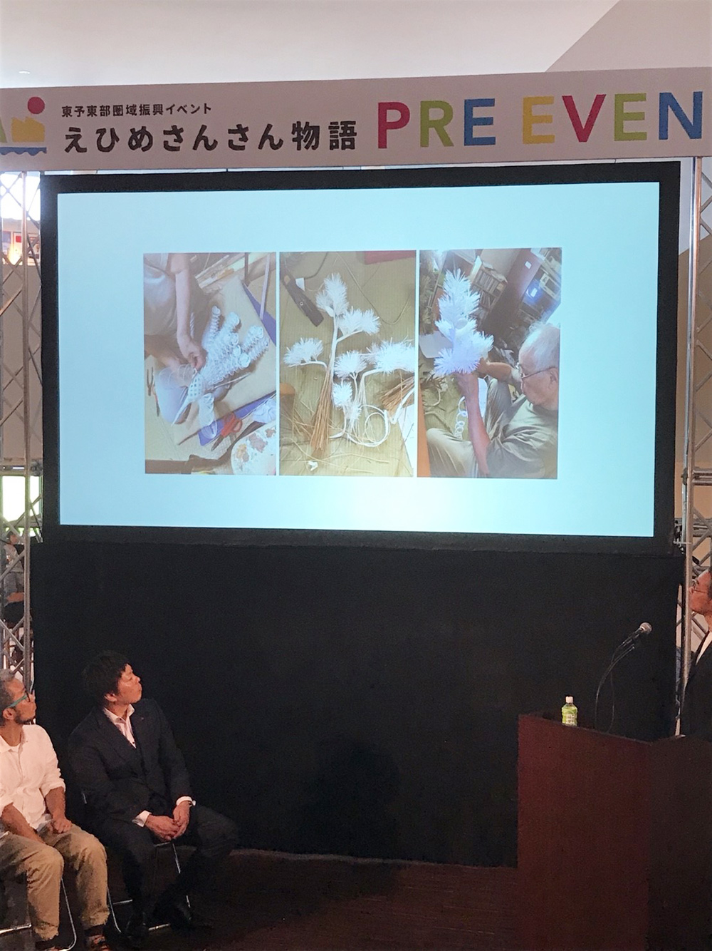 今回のプレイベントには、伝統工芸遺産の方々や組合に所属している市内の企業の賛同も得て作品作りを行ってきたそうです。その作品は、「絹巻き(白)のみで作る結納一式」。(通常は金や銀など様々な色を用いて作ります)。白一色にしたのは技の細部がよく見えること、インテリアとしての可能性を模索したなどの理由が挙げられました。とてもきれいに制作されていて、職人さんたちの技がしっかりと伝わる作品だと思いました。