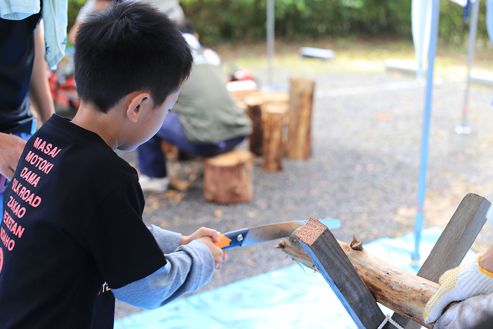子どもたちが興味津々だった、丸太切り・薪割り体験。