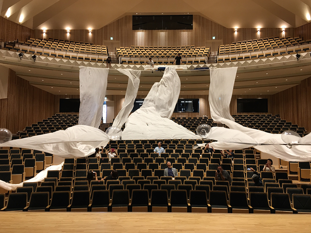 巨大なティッシュペーパーが上空から降ってきたり、トイレットペーパーが客席をリレーしたり……。紙とたわむれながら、最後には観る人も一緒になって海の世界を表現する2日間限定の参加体験型の作品です。
