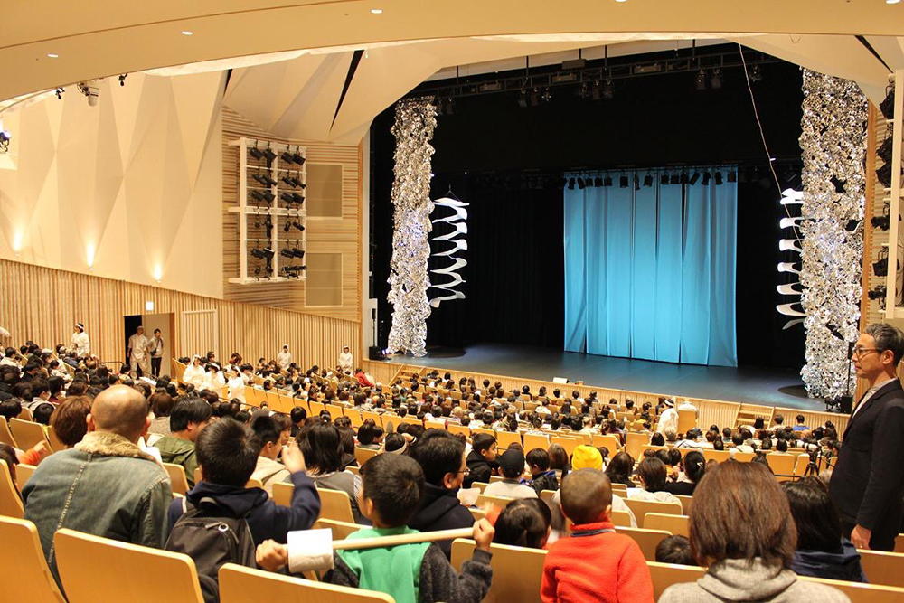 なんてったって、『にほんごであそぼ』でもおなじみの、ひびのこづえさん演出による舞台。待ちに待った当日を迎え、来館者もなんだかそわそわしていて、まだ何も始まっていないステージを眺めているだけでドキドキしてきます。一体どんな世界が繰り広げられるんだろう……?