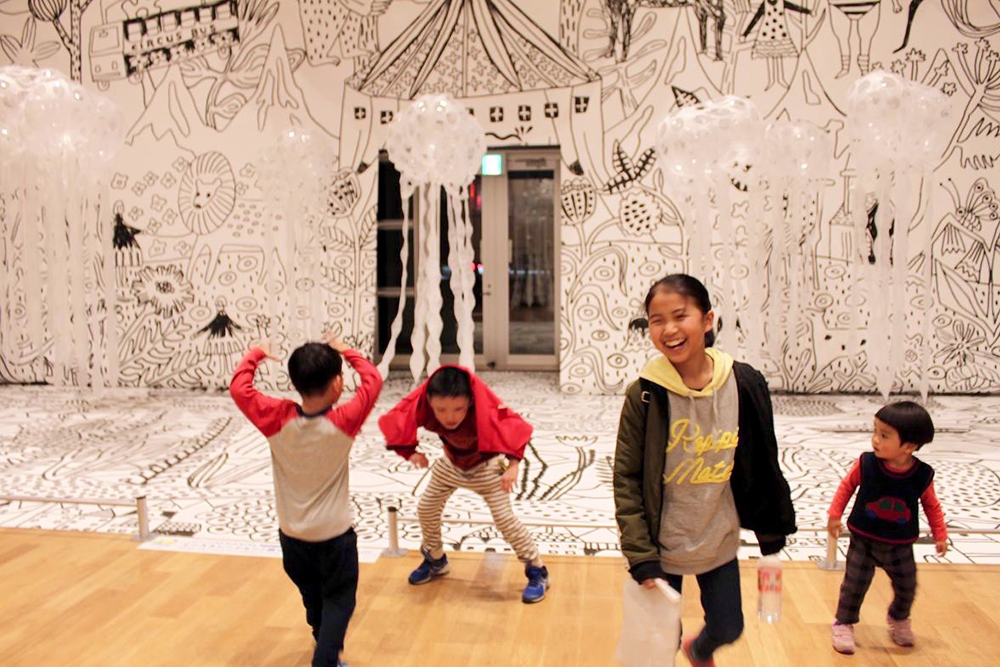 展示が始まった初日に訪れ、すでに鑑賞済みだったのですが、そのときとは全く違ったものに見えるのが不思議です(「紙のまち」のレポートはこちら)。“すごーい”で終わっていたまちが、一気に立体化して、膨らんでいくみたい……と、再び感動に浸っていたら、子どもたちはこの美しい作品の前でクラゲのマネして遊んでいた(笑)。